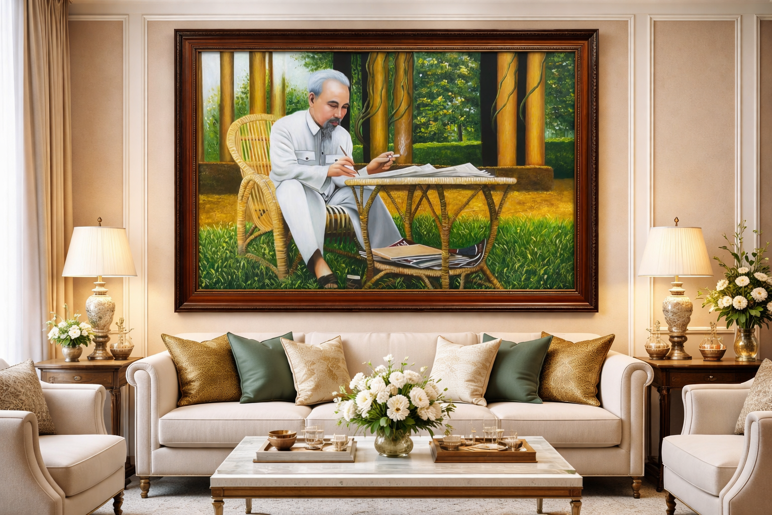 Tranh Bác Hồ ngồi ghế mây, làm việc SN114 – Biểu tượng giản dị và trí tuệ lãnh tụ