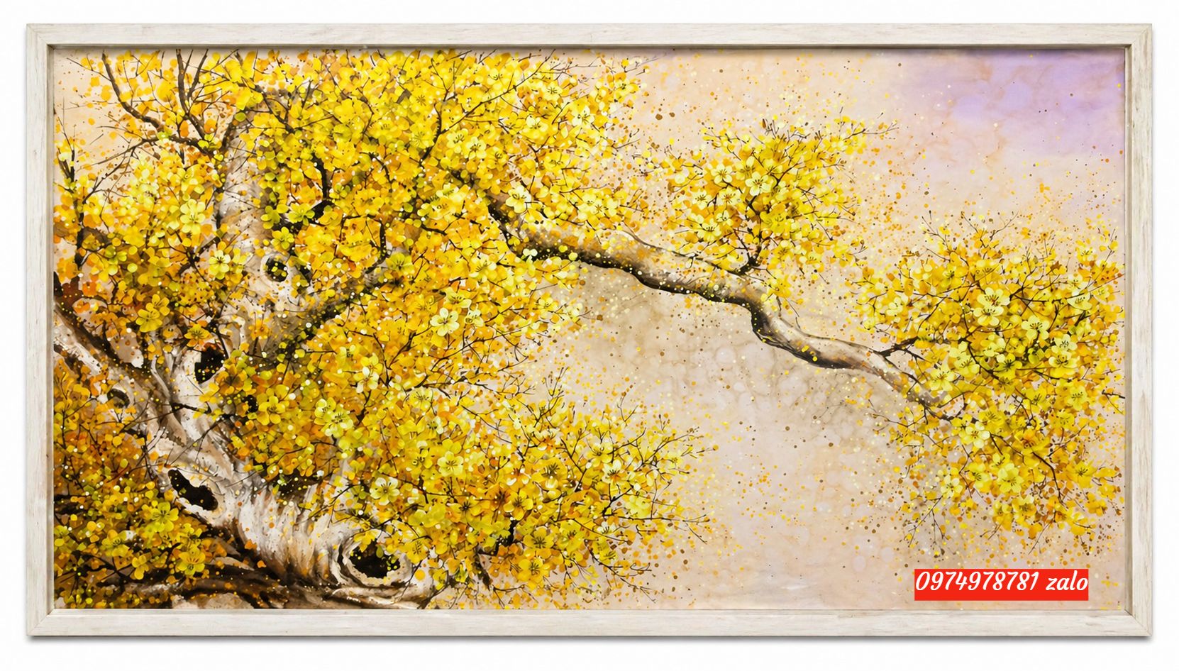 Bức tranh hoa mai vàng sơn dầu được vẽ tay hoàn toàn, từng cánh hoa, nhành lá và thân cây được thể hiện sống động với chiều sâu và độ nổi tự nhiên, tạo cảm giác chân thực và giàu cảm xúc nghệ thuật. Bố cục tranh thường trải dài theo chiều ngang, cành mai uốn lượn mềm mại tượng trưng cho sự phát triển bền vững và vươn lên mạnh mẽ, rất phù hợp treo tại phòng khách, phòng làm việc, sảnh lớn hoặc không gian kinh doanh. Không chỉ làm đẹp không gian, tranh còn góp phần tạo nên cảm giác thư giãn, gần gũi thiên nhiên và mang lại năng lượng tích cực mỗi ngày.